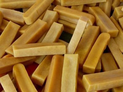 While other chews contain artificial coloring and glue, yak milk chews are digestible by the process of gnaw aging the cheese over time